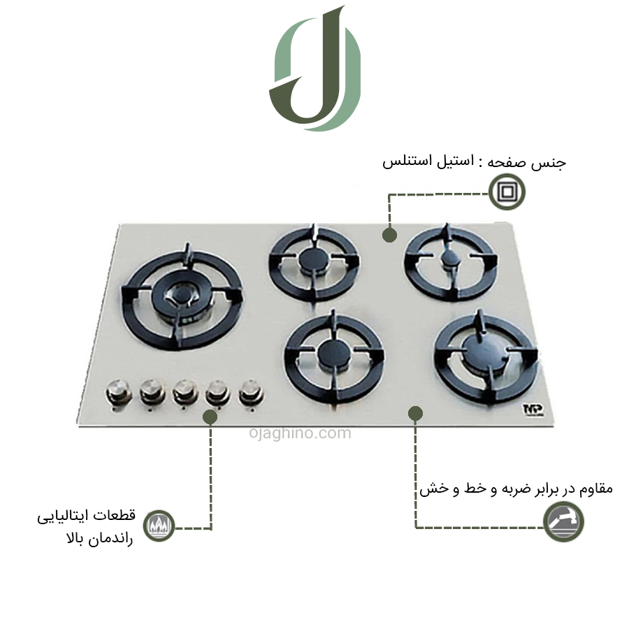 این گاز دارای 5 شعله میباشد که 1عدد پلوپز، 1عدد بزرگ، 2عدد متوسط، 1عدد کوچک است.