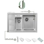 متعلقات سینک اخوان توکار مدل 376 شامل بست و زیرآب، دو عدد تخته برش، جامایع، میوه شور و سبد می باشد