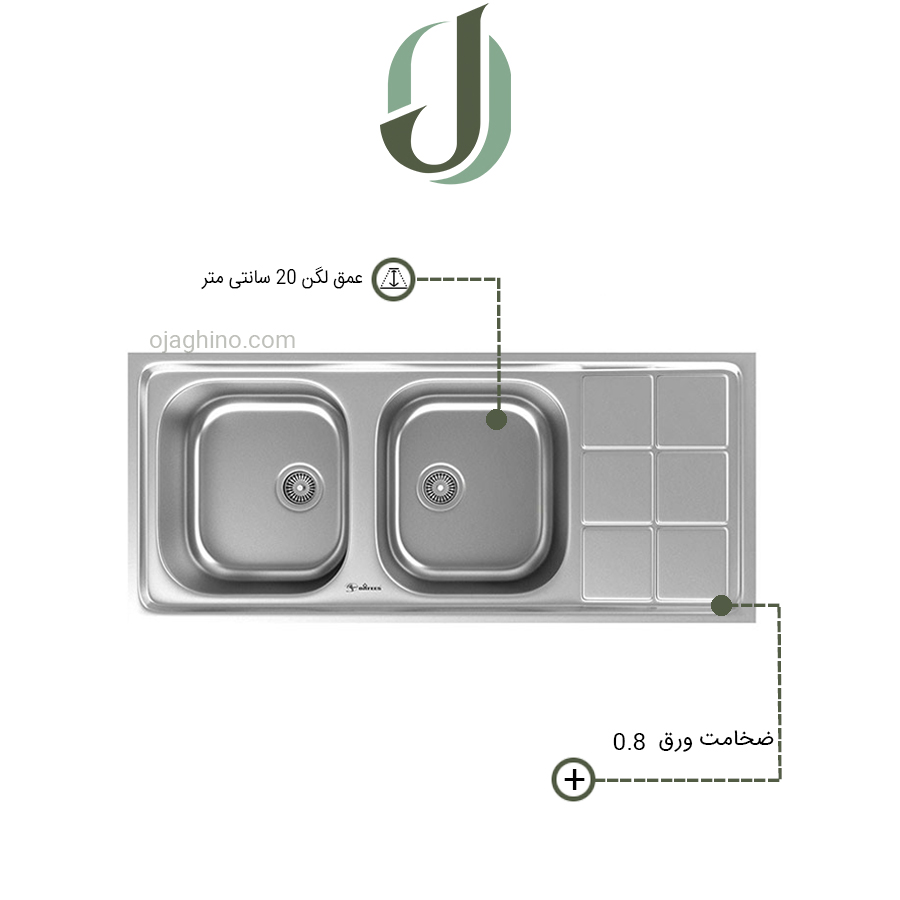 این سینک دارای استاندارد CE اروپا، 2 نوع لگن چپ و راست و دارای دو لگن بزرگ به عمق 20 سانتیمتر و متعلقات این سینک شامل بست و زیرآب , ست کامل سیفون می باشد.