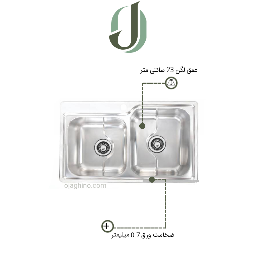 دارای دو لگن به عمق 23 سانتیمتر به ضخامت ورق 0.7 میلیمتر و آبریز لگن میباشد.