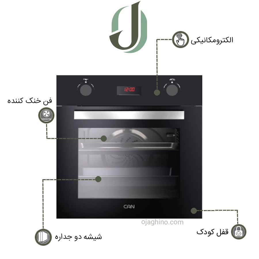 این فر دارای 8 برنامه پخت, لعاب مشکی, شیشه ی LOW-E، سنسور پخت گوش، تایمر, سیستم ایمنی خودکار، قفل کودک، فن خنک کننده اتومات، فن گردش هوای داغ, استیک پز, سینی عمیق و شلف میباشد.