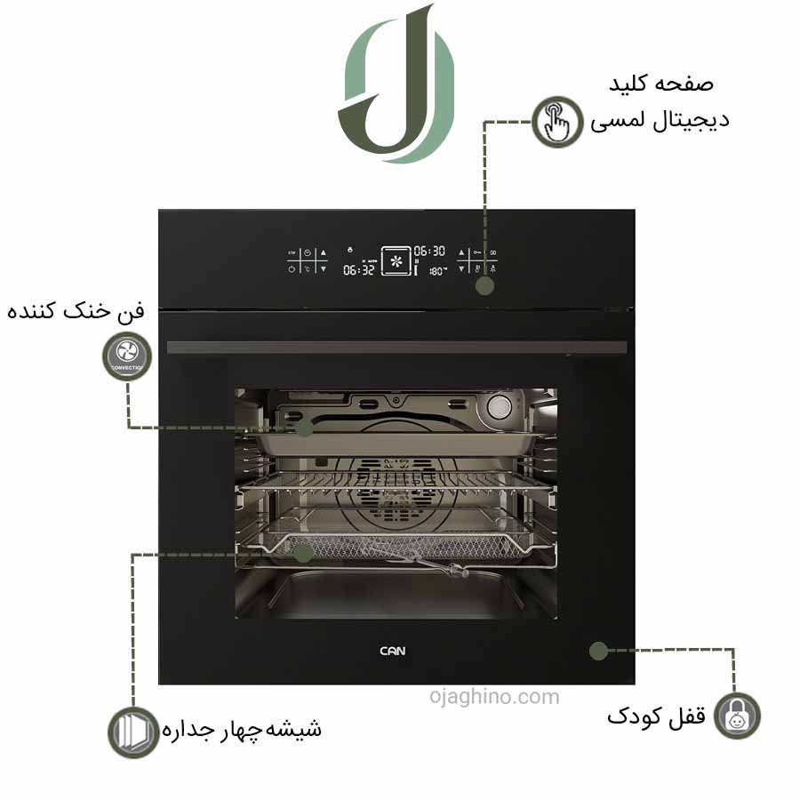 این فر دارای 13 برنامه پخت، لعاب طوسی(نظافت آسان)، سیستم پخت، یخ زدا، شیشه ی چهار جداره، شیشه LOW-E، سنسور پخت گوشت، تایمر، سیستم ایمنی خودکار، قفل کودک، درب آرام بند، فن خنک کننده اتومات، فن گردش هوای داغ، پخت سریع، پخت با تاخیر، هواپز AERO CHEF، جوجه گردان، سینی عمیق و سینی نیمه عمیق میباشد.
